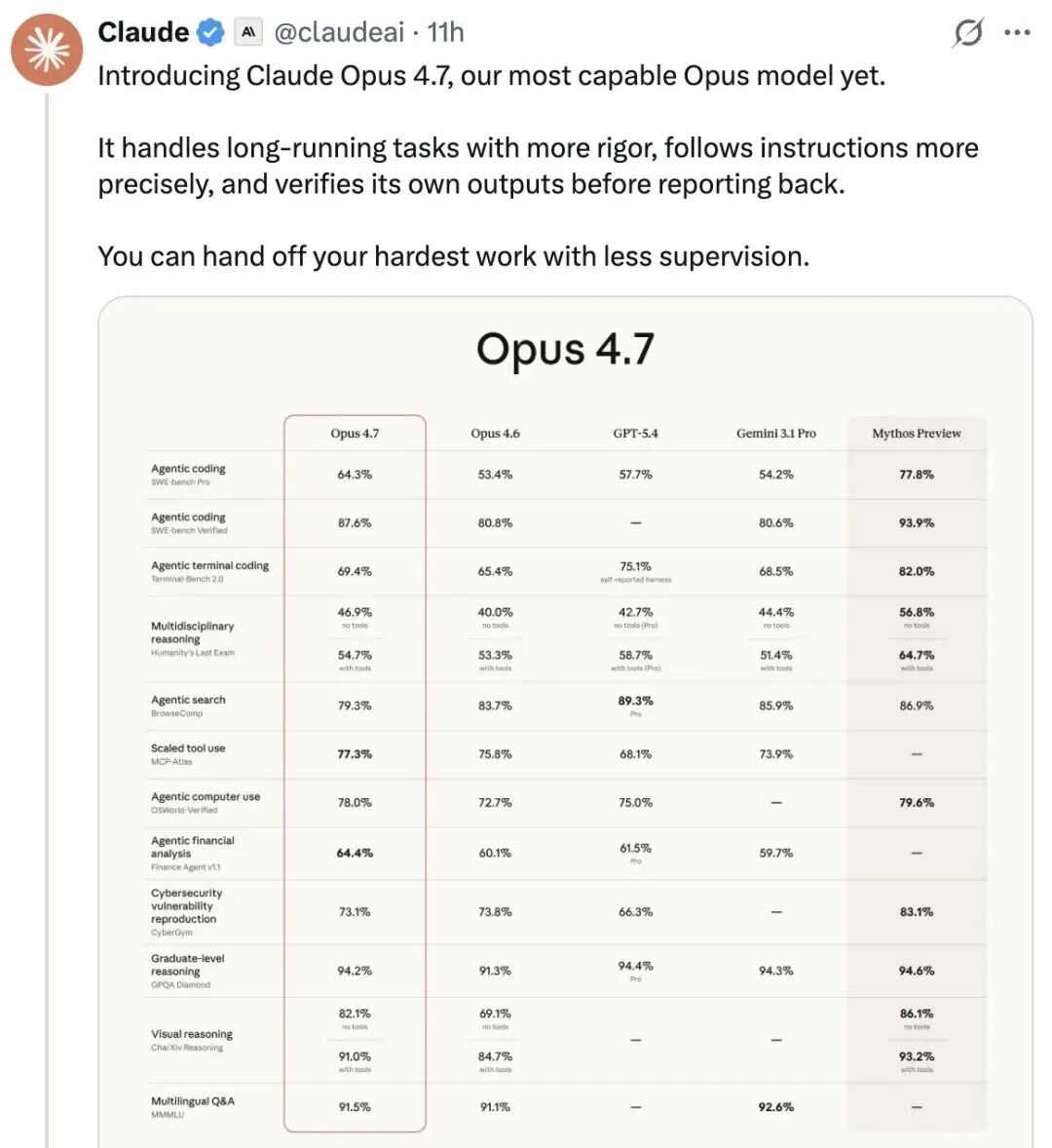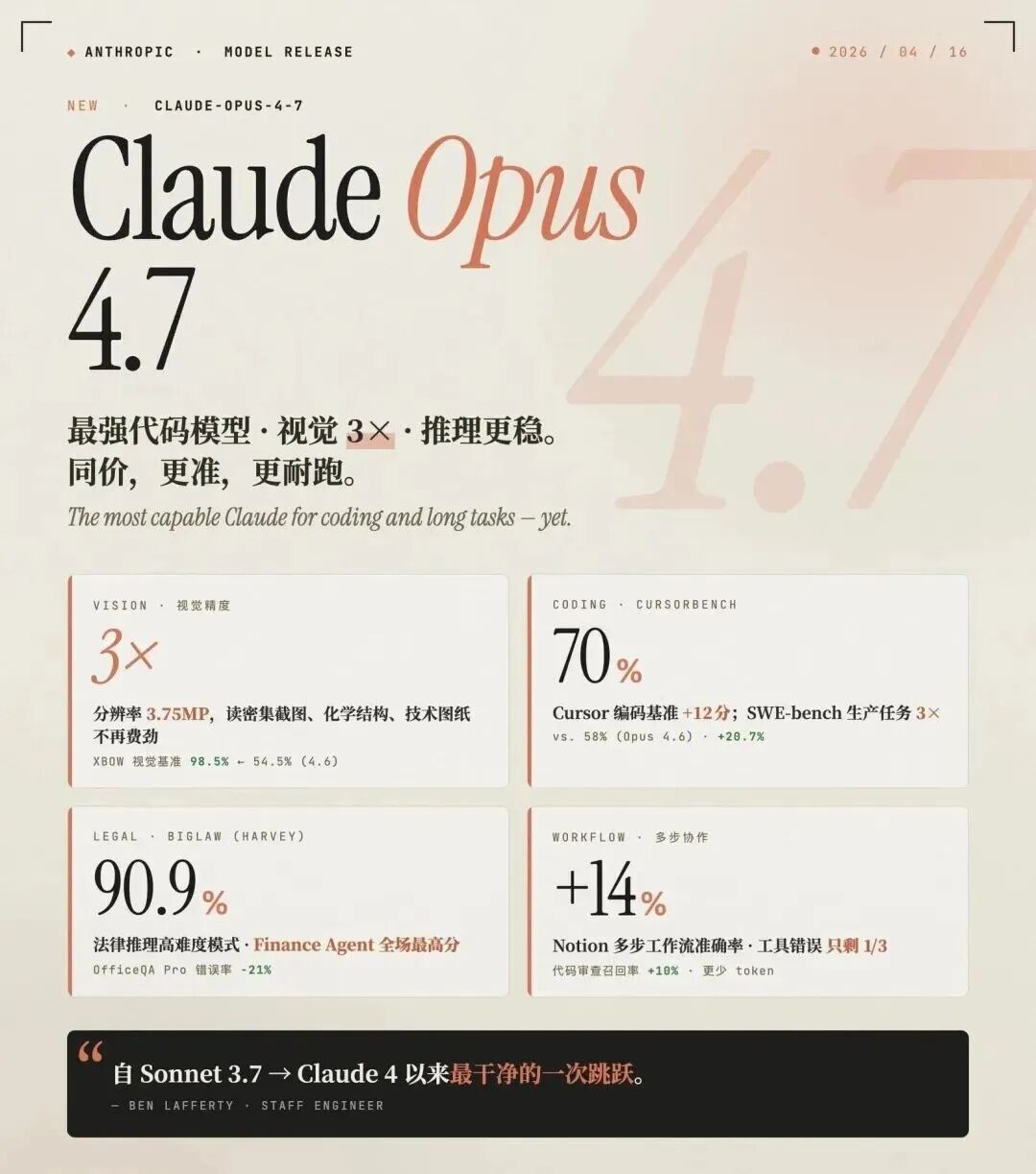 2026 年 4 月 16 日,Anthropic 连夜把 AI 大模型的基准测试榜单又给洗牌了。前几天还在讨论如何用其他模型平替 Claude Opus 4.6,结果新发布的 Opus 4.7 直接把天花板又往上抬了一大截。在 SWE-bench Pro 这类硬核编程基准测试中,Opus 4.7 把 OpenAI 的 GPT-5.4 和 Google 的 Gemini 3.1 Pro 都甩在了身后。这一波操作,仿佛是 Anthropic 在发布自家的“Mythos”之前,先扔出的一颗重磅炸弹。接下来,就一起从技术角度,把这台新“卷王”的底细扒个干净。