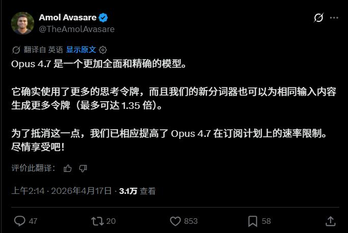 25/百万 token。但要注意:4.7 换了新 tokenizer,同样文字切出来的 token 可能多 1.0 到 1.35 倍,实际账单可能会略高一些。