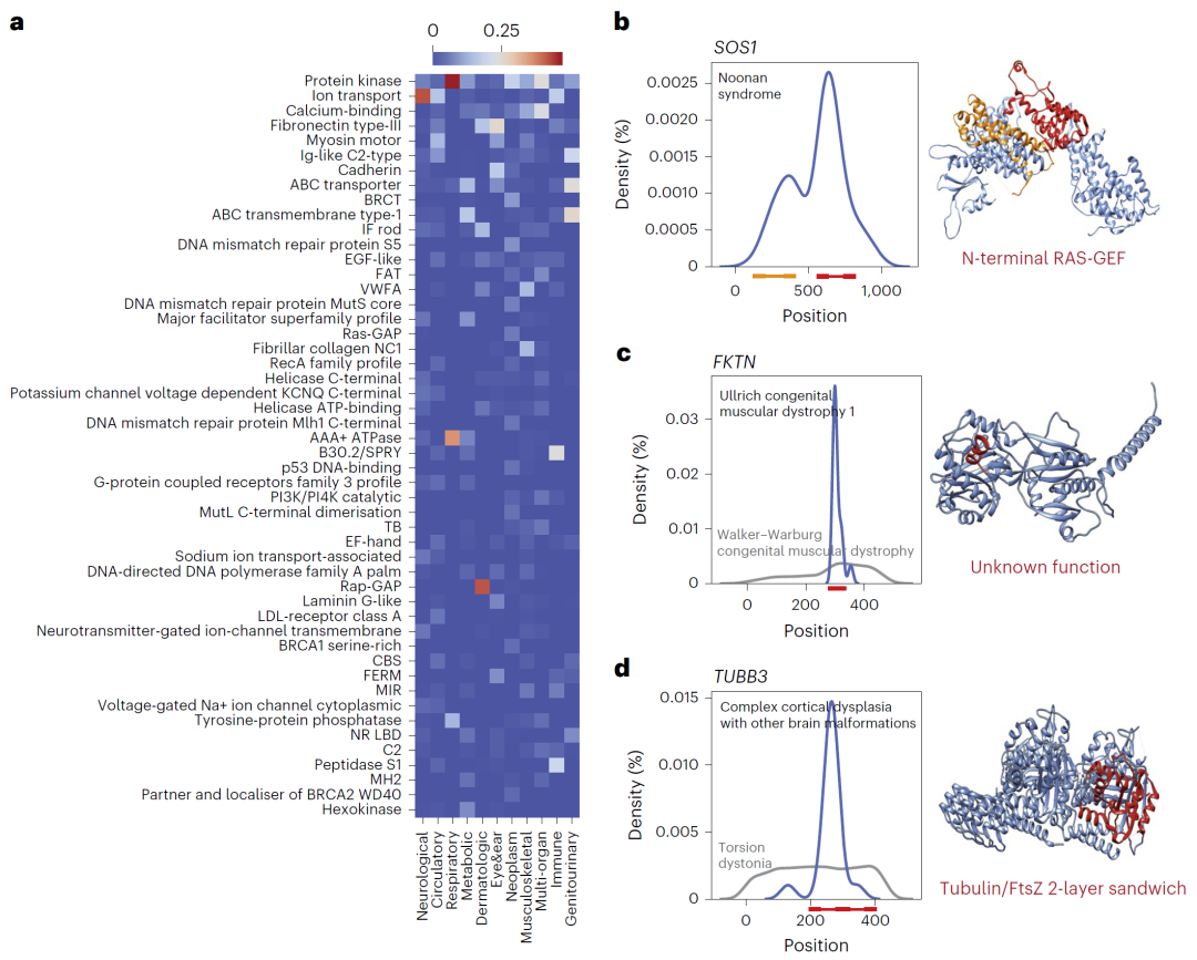 研究人员进一步分析模型预测结果与已知生物学规律之间的关系。结果发现,不同蛋白结构域的突变与特定表型之间存在清晰对应关系,例如离子通道相关结构域主要关联神经和循环系统疾病,而线粒体相关结构域则与代谢和呼吸系统疾病相关。