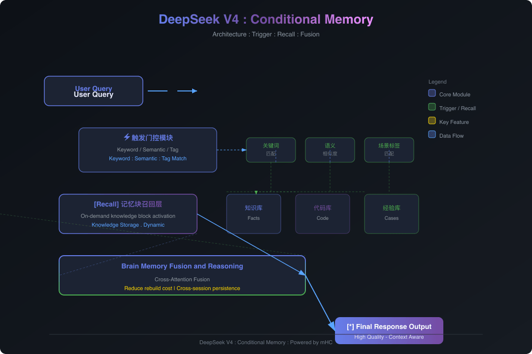 V4引入了一项创新性的条件记忆模块,这是对传统RAG(检索增强生成)思路的架构级整合: