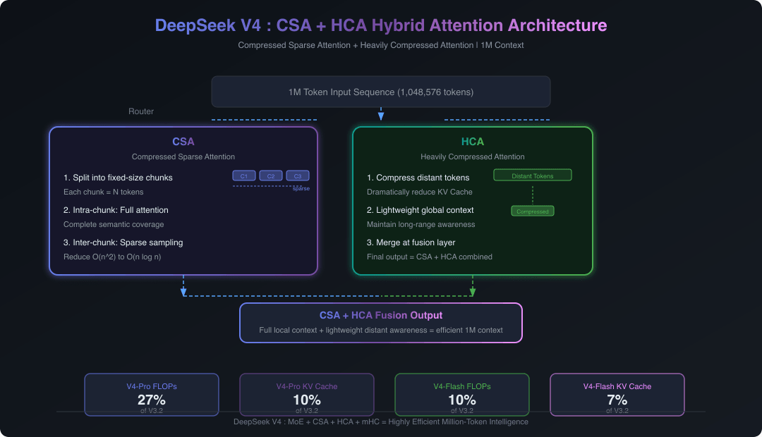 这是V4最核心的创新。传统全量自注意力在百万Token场景下计算量呈二次方爆炸,V4通过全新的分层注意力架构解决了这个问题: