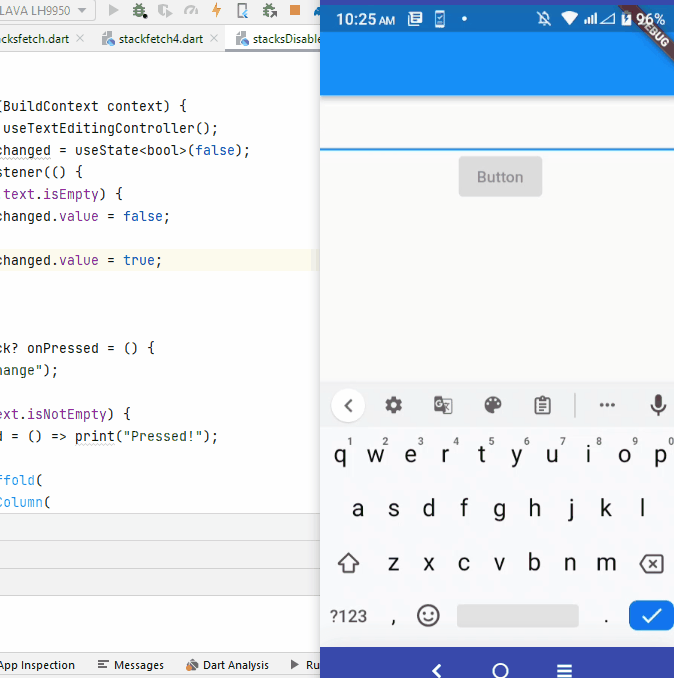 在下面的示例中,当我在文本字段中输入test时,按钮永远不会启用,因为生成没有被触发?当使用带有颤振钩的文本编辑控制器时,如何触发生成?
