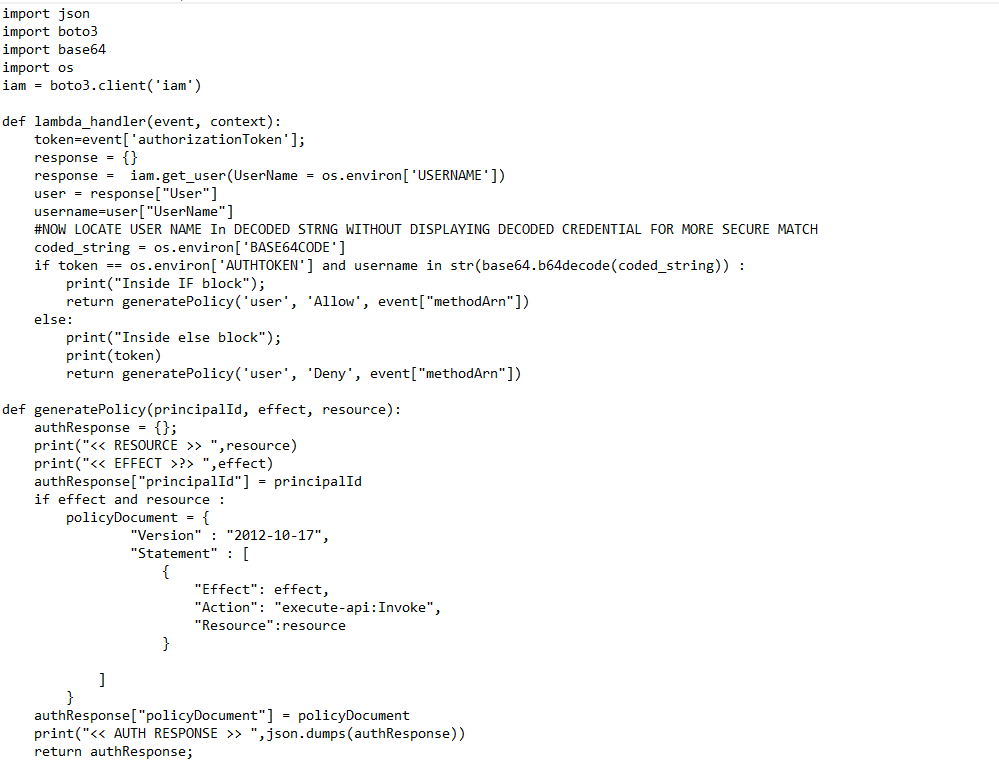 当我有一个活跃的测试用户时,只要Punchh或Iterable webhooks push(Post)数据,他们就可以访问API网关。但是,如果在IAM中禁用同一用户(密码为null),则不应允许该用户访问网关。不幸的是,一旦IAM测试用户被停用/禁用,仍然允许访问这两个外部服务器。我不想使用boto3对凭证报告csv文件进行编程和搜索,该文件被编码为base64。这将暴露太多的帐户用户信息-非常危险。是否有另一种方法可让Lambda Authorizer函数确定IAM用户何时已被停用?