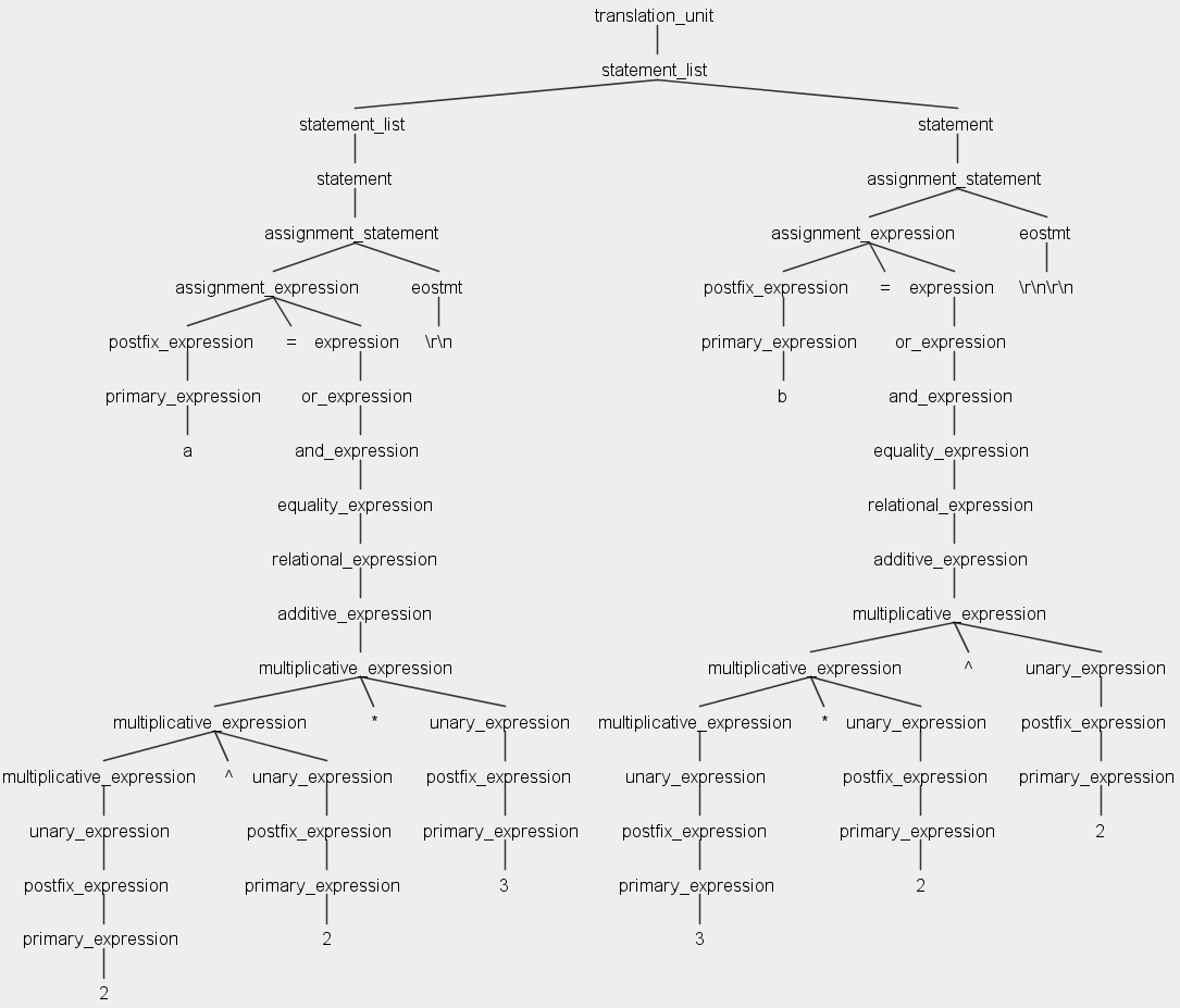 b = 3*2^2结果在这两种情况下都应该是12,但不是,因为使用ANTLR4的Matlab语法中的指数操作符不能正确工作,这显示了下面的树