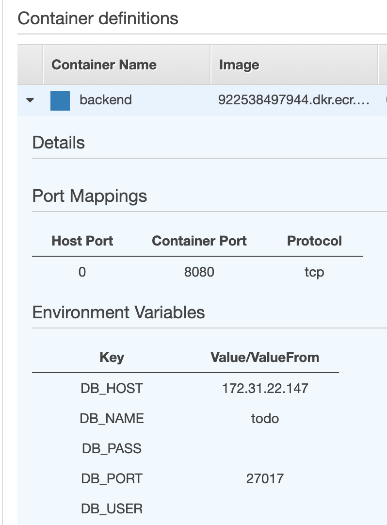 解决办法:后端的env变量需要用DB_HOST更新,以便它可以连接到托管在同一个ec2 SPOT实例上的数据库任务。