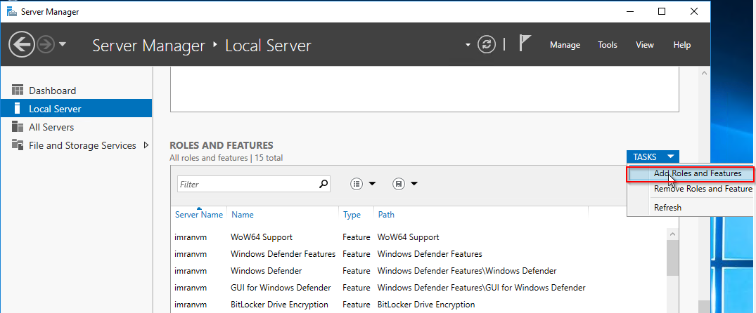 在服务器管理器->本地服务器->中向下滚动->添加角色和特性->下一步