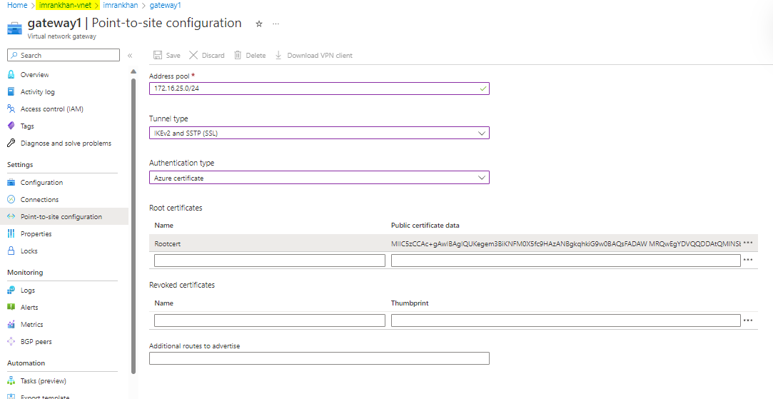 我已经创建了虚拟网络网关p2s配置,如下所示。