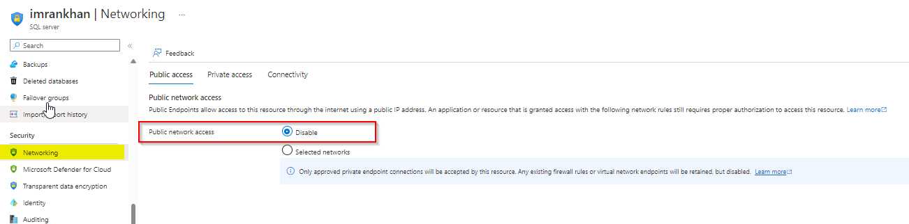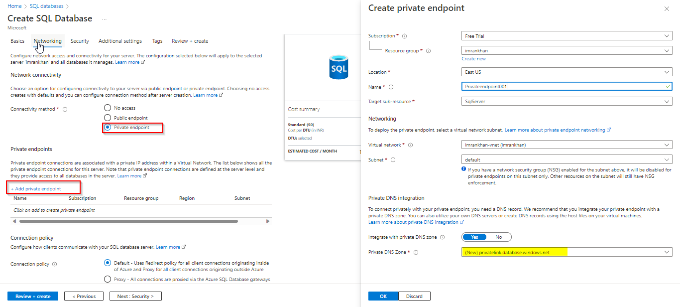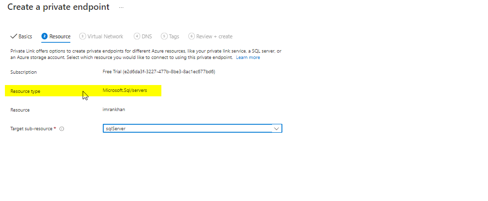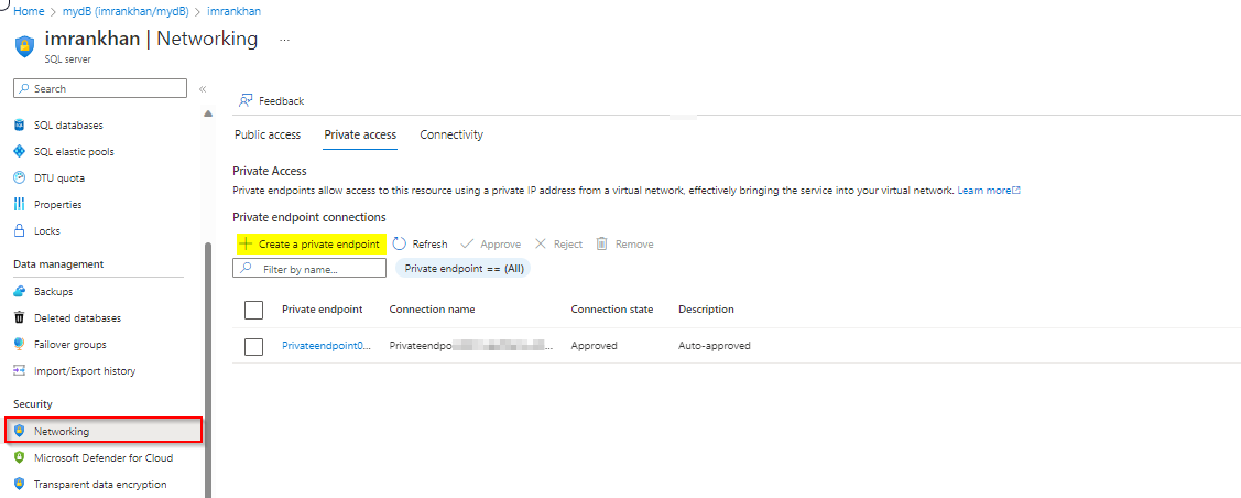 在SQL server中,我使用创建了新的Microsoft.sql/server专用端点,如下所示: