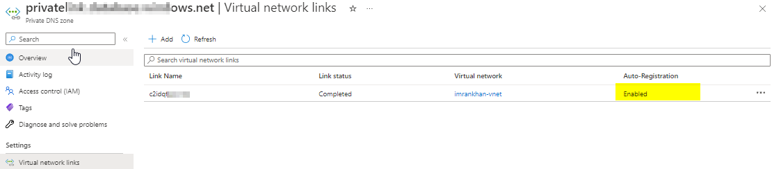 私有dns区域中的 ->虚拟网络链接->启用自动注册,如下所示: