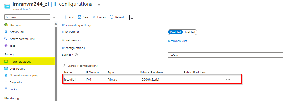 然后,我创建了虚拟机来连接没有公共ip的远程桌面,并尝试将您的网络接口更改为静态ip地址,如下所示: