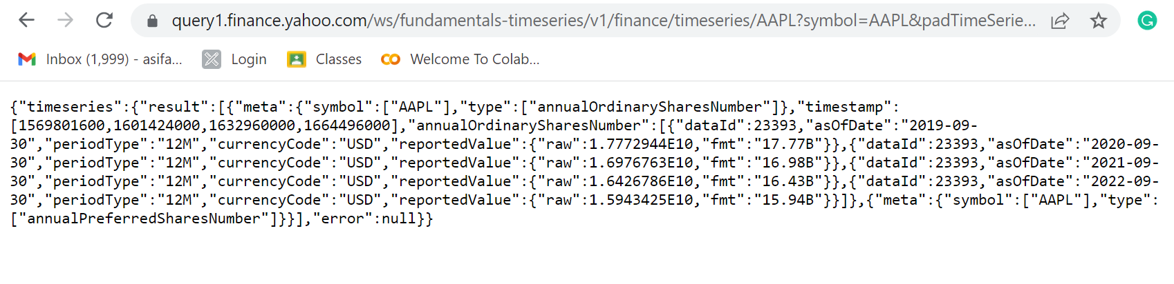 但是搜索铬中的链接https://query1.finance.yahoo.com/ws/fundamentals-timeseries/v1/finance/timeseries/AAPL?symbol=AAPL&padTimeSeries=true&type=annualPreferredSharesNumber,annualOrdinarySharesNumber&merge=false&period1=0&period2=2013490868,通过放置一个代码,比如,AAPL,它提供了一些数据,比如,