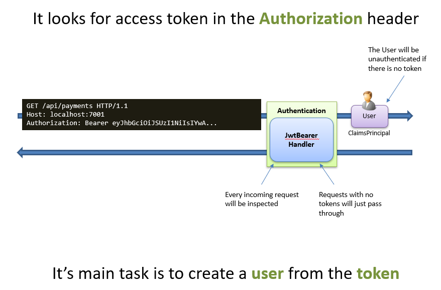 对于ASP.NET核心中的WEB.API,您也可以在启动类中使用AddJwtBearer方法来保护它。它将查看传入的请求,然后如果找到有效的令牌,则创建一个ClaimsPrincipal用户。