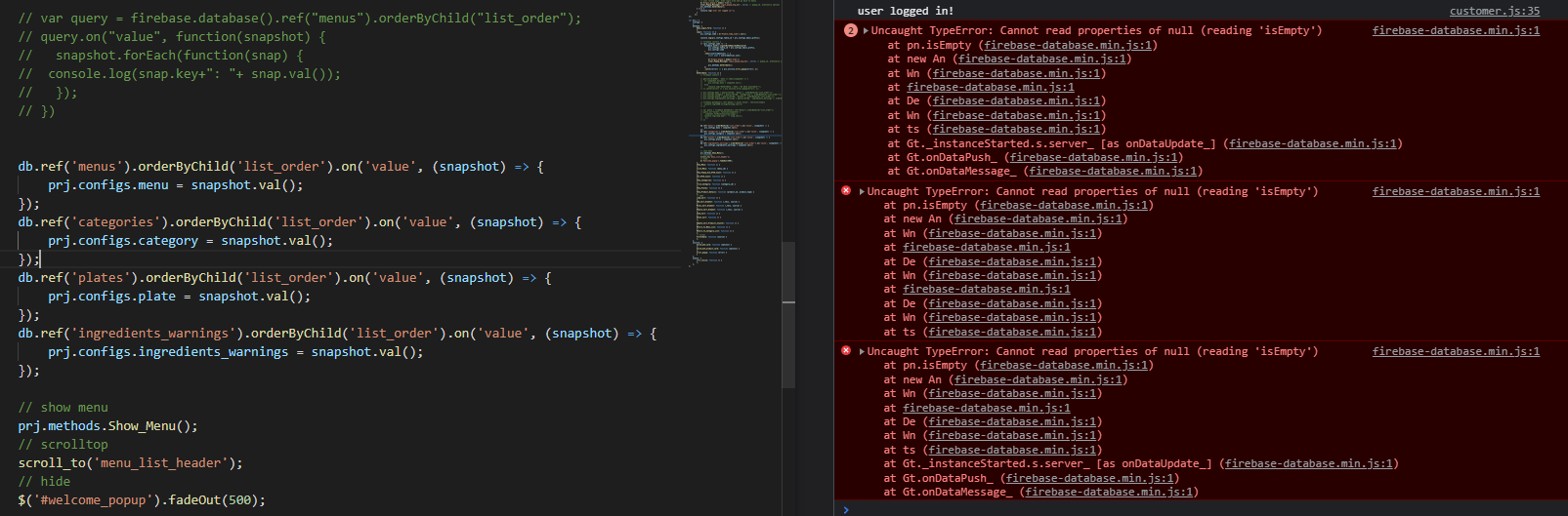 使用firebase,我成功地登录了一个用户,但后来我无法从实时数据库查询任何数据。console说snapshot.val()为null,或者在firebase-database.min.js中触发一个错误。我尝试了许多类型的查询和路径格式的参考值(从官方文档和论坛)。当我尝试console.log快照时,它会返回一个firebase对象。添加.val()返回null。但我有数据库的数据。