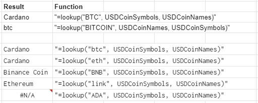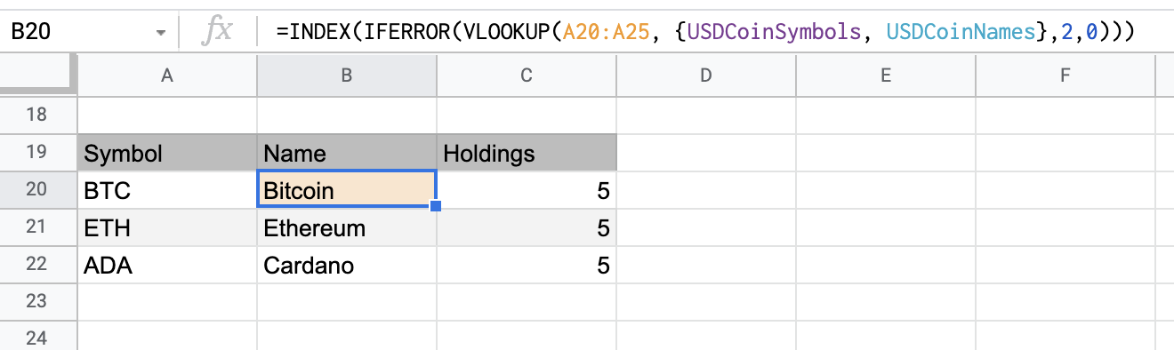 =INDEX(IFERROR(VLOOKUP(A20:A25, {USDCoinSymbols, USDCoinNames},2,0)))