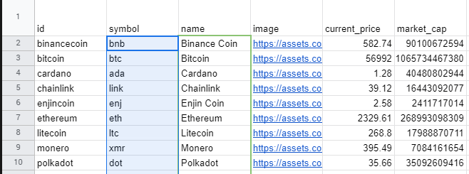 编辑:这是一个用于示例电子表格的链接,我正在使用CoinGecko API来获取这些数据。
