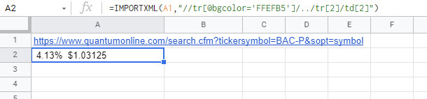 =IMPORTXML(A1,"//tr[@bgcolor='FFEFB5']/../tr[2]/td[2]")https://www.quantumonline.com/search.cfm?tickersymbol=BAC-P&sopt=symbol的URL。结果: