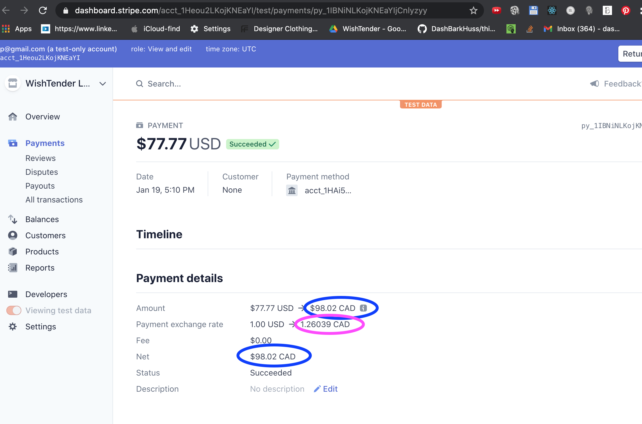我的平台是美元。在这个具体的例子中,Connect帐户以CAD (加拿大元)为单位。当有人从这个CAD连接帐户购买一个项目时,Stripe将钱放在我的平台帐户中,将我的应用程序费用留在那里,然后将正确的金额移动到CAD Connect帐户中。它将此金额转换为CAD。在条形图形用户界面中,我可以找到在中转移的和汇率,如下面的截图所示。但是我在中找不到这些属性。