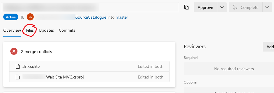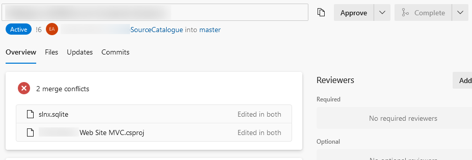 我没有(有意识地)编辑这些文件,所以不明白它们为什么会显示,不能合并。我使用的是Visual 2019,它似乎没有显示任何冲突(我可以看到或发现)。