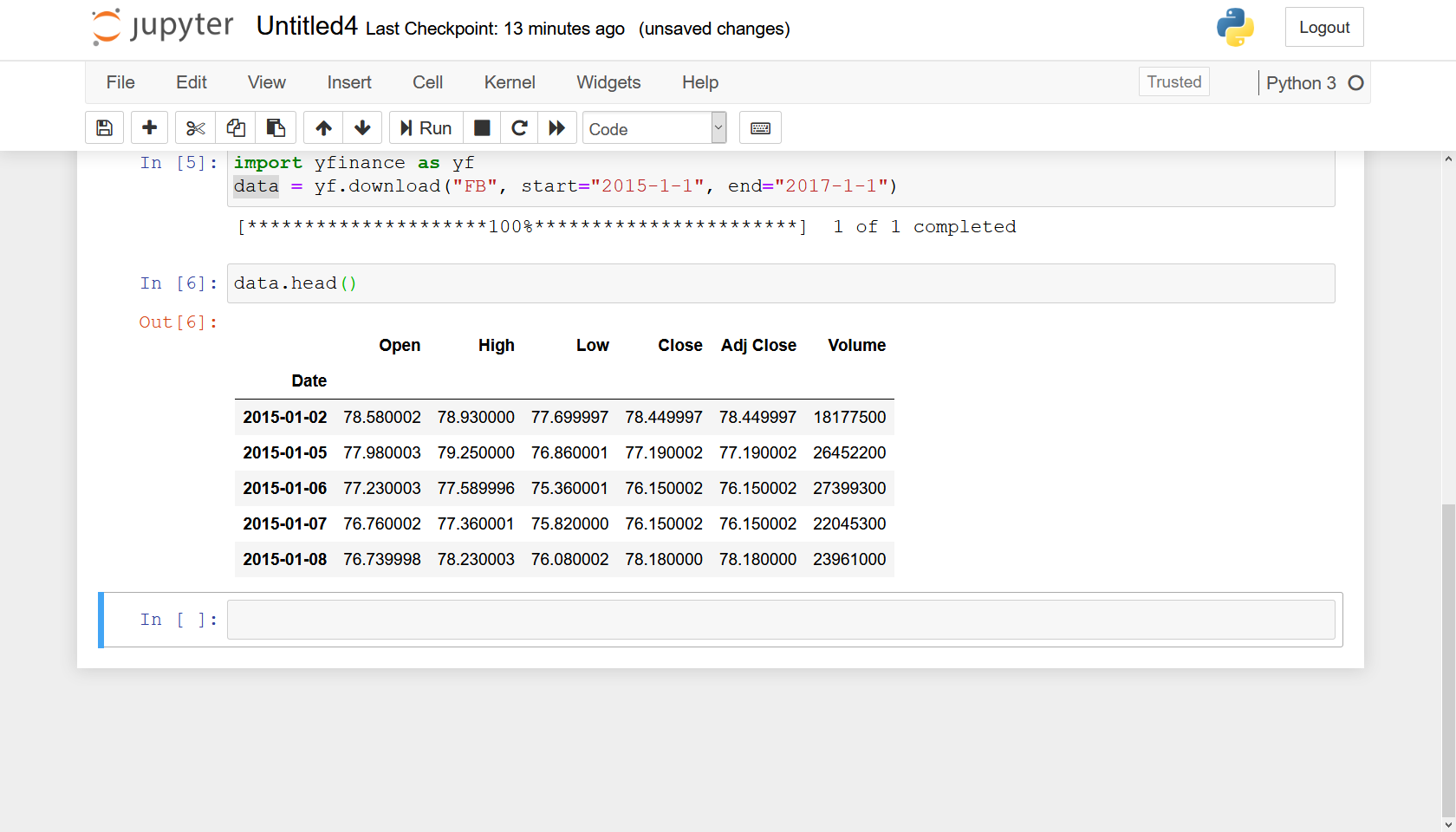facebook = yf.download("FB", start="2015-1-1", end="2017-1-1")