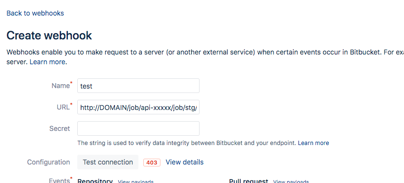 1. 在web钩子,秘密(Optiona)中,字符串用于验证Bitbucket和您的端点之间的数据完整性。在我的端点( Jenkins服务器)中有什么需要配置的吗?完整性检查在这里是如何工作的?