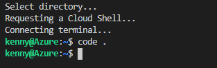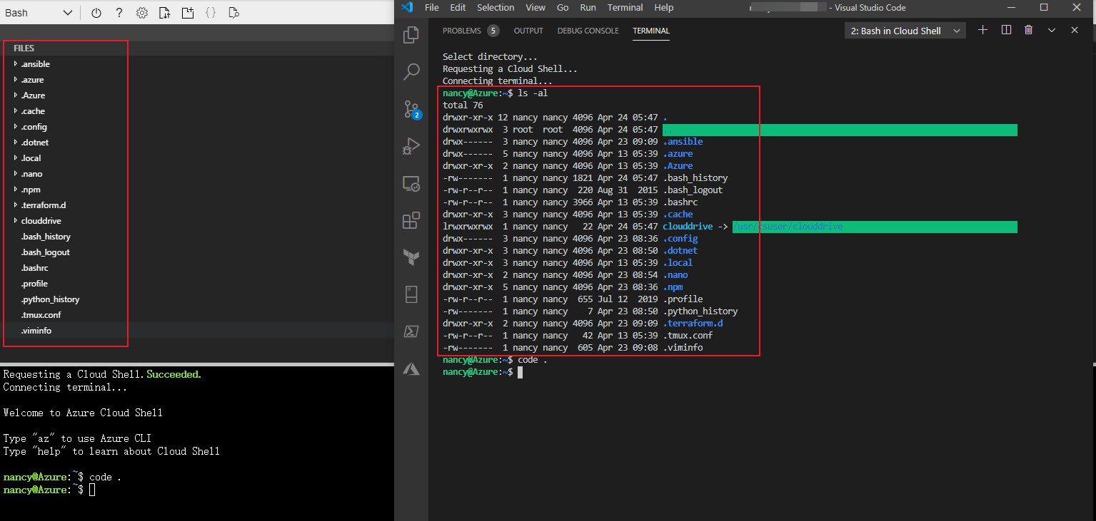 实际上,输入code .是用来使您打开VS代码编辑器的。现在您有了代码中使用的云Shell,当您在Visual代码终端中输入code.时,什么都不会发生。您还可以在Visual代码中的云外壳中打开文件目录时,比较Azure中的文件目录和文件目录。