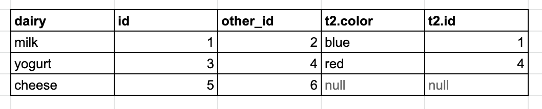 Row dairy id other_id t2.color t2.id