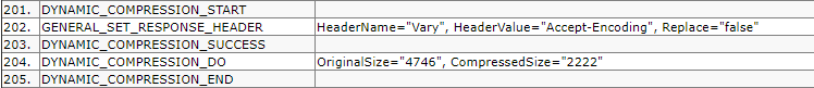 3、通过FTP或KUDU在web应用程序的root\LogFiles\W3SVCXXX文件夹中找到日志(推荐)。文件名类似于"fr000001.xml“。在KUDU页面中,单击“下载”按钮将在友好的视图中打开日志。在日志中搜索“压缩”。以下是一个成功的例子:
