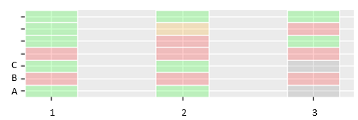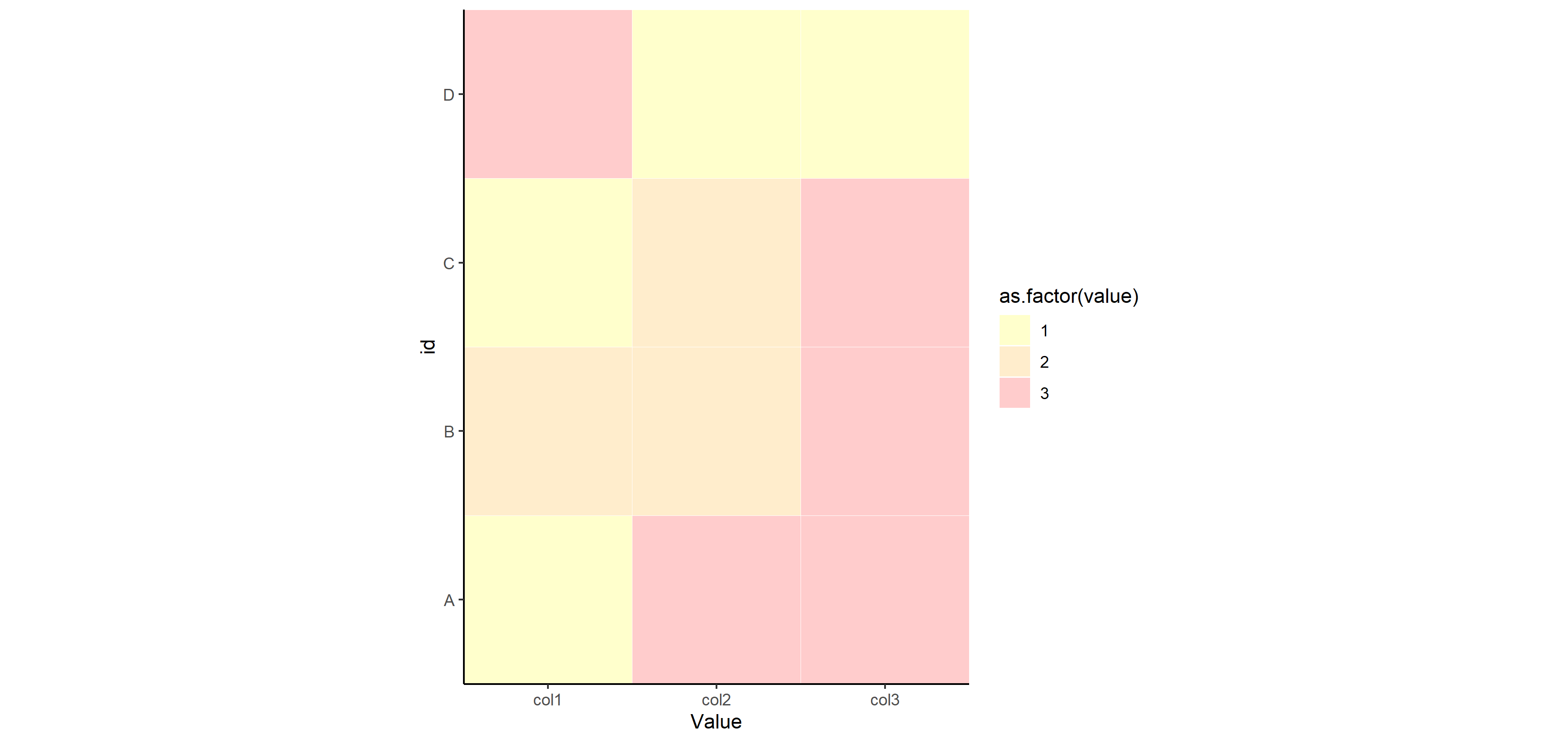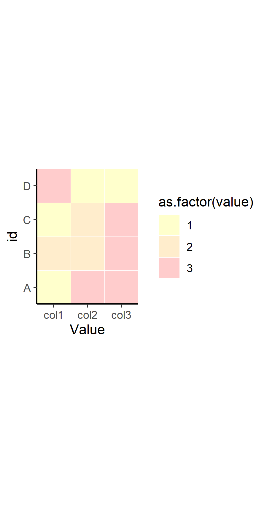 #4 D 3 1 1我想要创建一个“热图样”的图形,其中col1-col3被当作一个因子变量(5个级别1-5,不是全部显示在这里),并且根据它们的值,它们得到了不同的颜色。对于以下代码,我已经取得了相当大的进展: