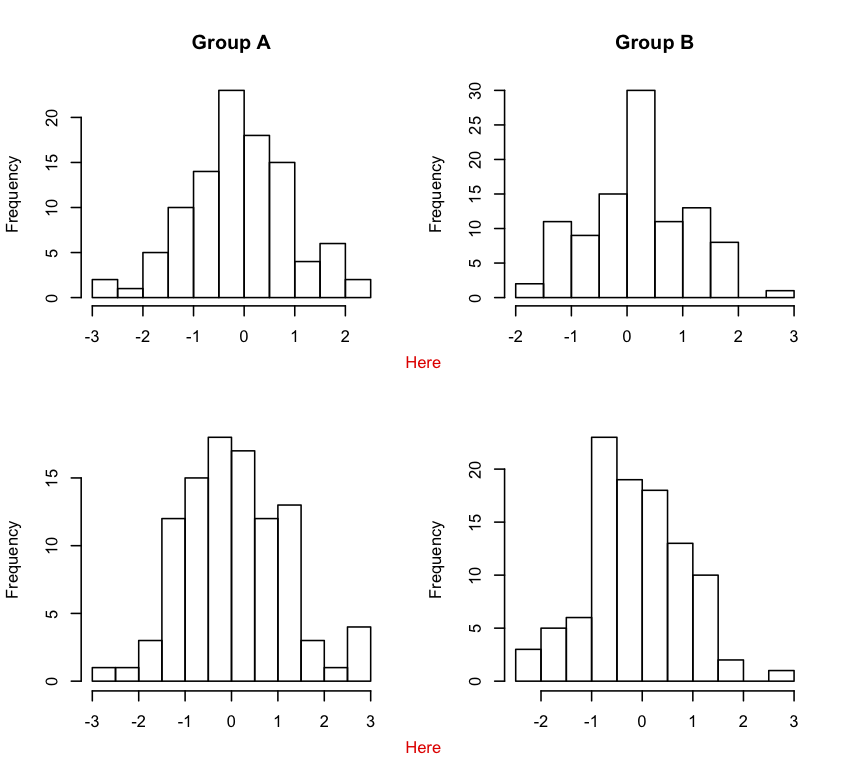 hist(x4, xlab="", main="")这将创建下面的多个绘图面板,但我也添加了红色文本。我在R中创建了图形面板之后,通过注释PDF文件添加了红色文本,然后将其保存为PDF格式。我想学习的是如何在R中以编程方式注释图形面板,而不是保存它和注释保存的文件。