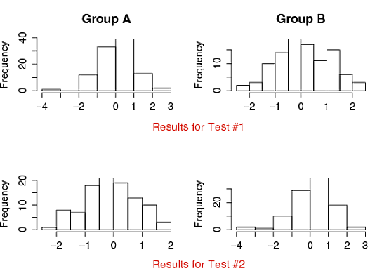 hist(x1, xlab="", main="Group A")