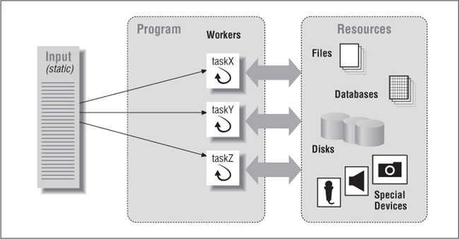 perform task, synchronize as needed if accessing shared resources