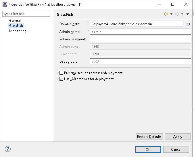 文件中完成的更改。单击、Apply和Ok,您将全部设置为运行Glassfish服务器实例。希望,这可以帮助人们避免重新启动eclipse的残酷循环,系统,以及对glassfish/ eclipse实例的完整处理。