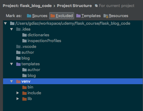 在PyCharm 2017.2.4中,您可以使用cmd+shift+A并开始键入项目结构.应该显示project structure选项,然后按<enter>。然后,您可以突出显示要排除的文件夹,并将其标记为Exclude。当您想使用cmd+shift+O搜索文件并且不希望venv文件出现时,这是非常有用的。
