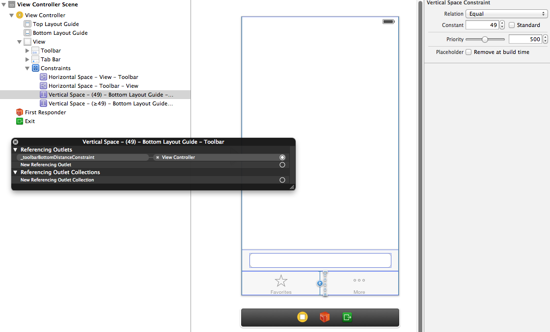 这还有另外一个窍门。工具栏位于我的故事情节提要中,使用约束。离视图底部的距离有两个限制。其中一个绑定到IBOutlet "_toolbarBottomDistanceConstraint",这是代码用来移动工具栏的内容。这种约束是具有“等”关系的“垂直空间”约束。我把优先权定在500。第二个平行的“垂直空间”约束具有“大于或相等”的关系。这上面的常量是到视图底部的最小距离(例如,在选项卡栏上方),优先级是1000。有了这两个约束,我可以将工具栏从底部的距离设置为我喜欢的任何值,但它永远不会降到我的最小值以下。这是使键盘看起来像是在推/拉工具栏,但让它在某一点上“放下”动画的关键。