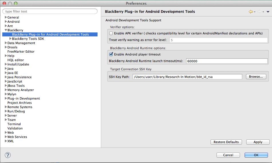 在Eclipse中-首选项-黑莓-黑莓插件-为Android取消选中“启用APK验证器”选项