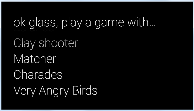 <string name="app_name">Very Angry Birds</string>在谷歌眼镜的家中尖叫,用户会说:“好的玻璃,玩一个游戏,非常愤怒的小鸟”。
