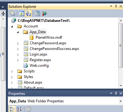 我正在学习ASP.NET从“ASP.NET 4:在C#和VB中开始”一书。这里,作者在数据库章节中指示创建一个新的ASP.NET网站项目,然后在App_Data文件夹中添加一个mdf文件(此文件附带图书源代码)。我照指示做了。