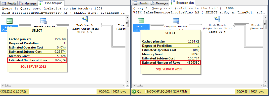 下面是SQL 2012和SQL 2014中操作符1和2的基数估计:
