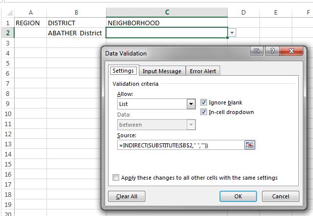我在Excel中做了一系列的级联下降。当用户在ColumnB中选择一个选项时,工作表找到一个列表“Name”= ColumnB值,并使用该列表为该列设置验证。
