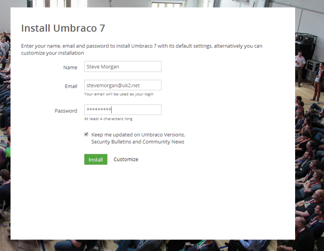 我安装了Umbraco 7.2.2。来自最新的nuget包装。但是,令人恼火的是,我刚刚从初始安装向导中单击了 install ,如下所示。