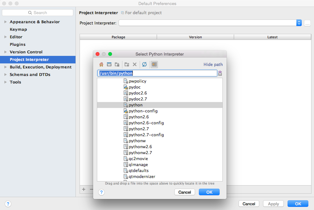 我在这个Mac上安装了Python2.7.11,并且可以从终端Python2.7.11启动。但是,在Pycharm的解释器(2016.1版本)中,没有Python2.7.11。