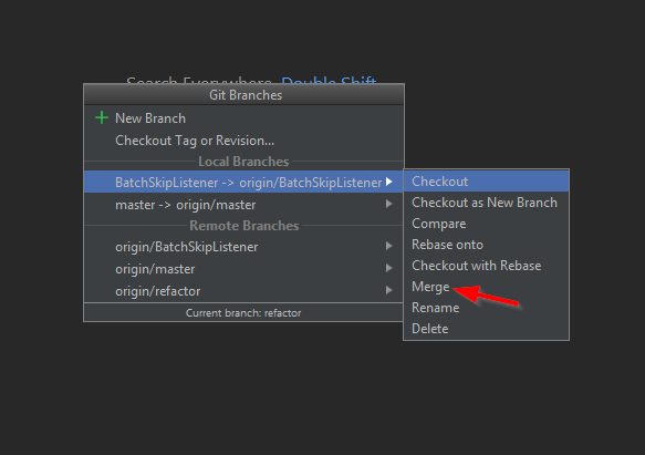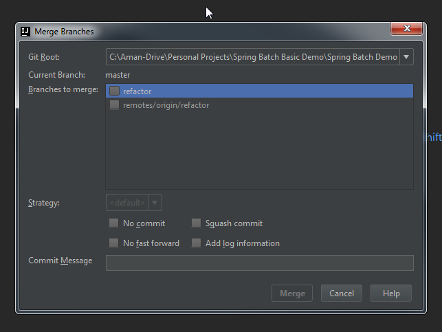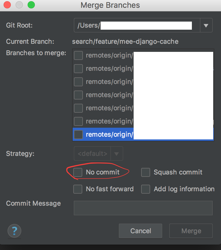 当分支从分支对话框合并时,我想禁用自动提交到Intellij上的合并,如下所示。