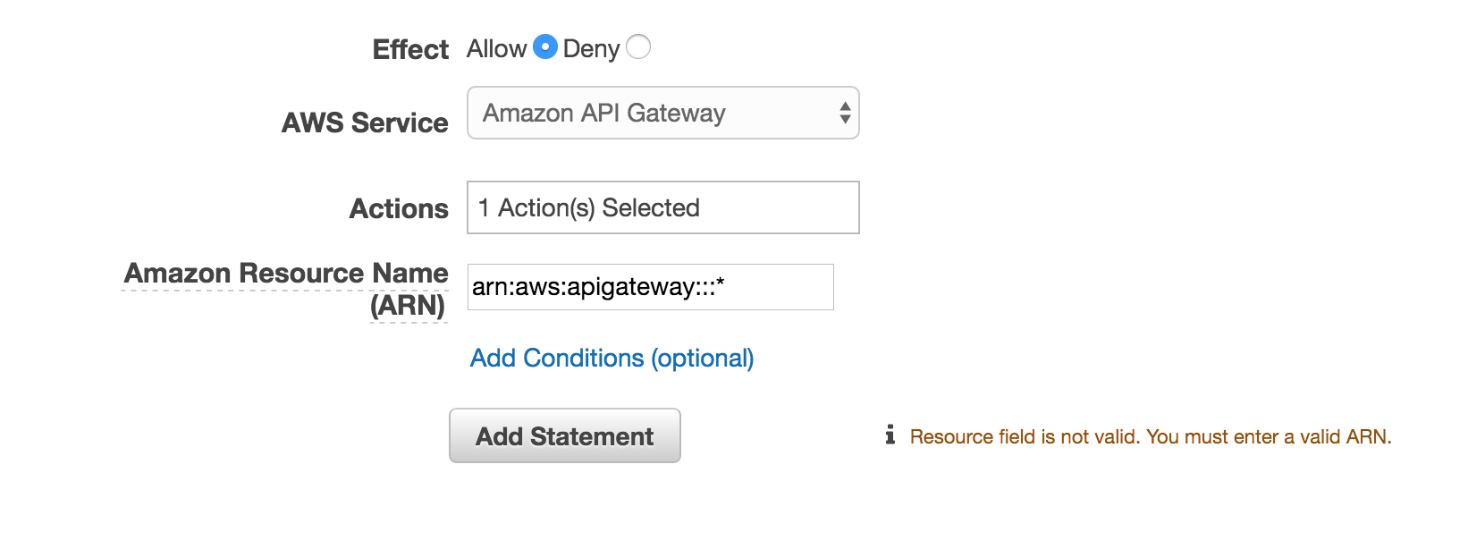 从文档:使用IAM控制台中的策略生成器创建IAM策略,选择Manage网关作为AWS服务为apigateway设置权限语句,选择Amazon网关作为AWS为execute设置权限语句。