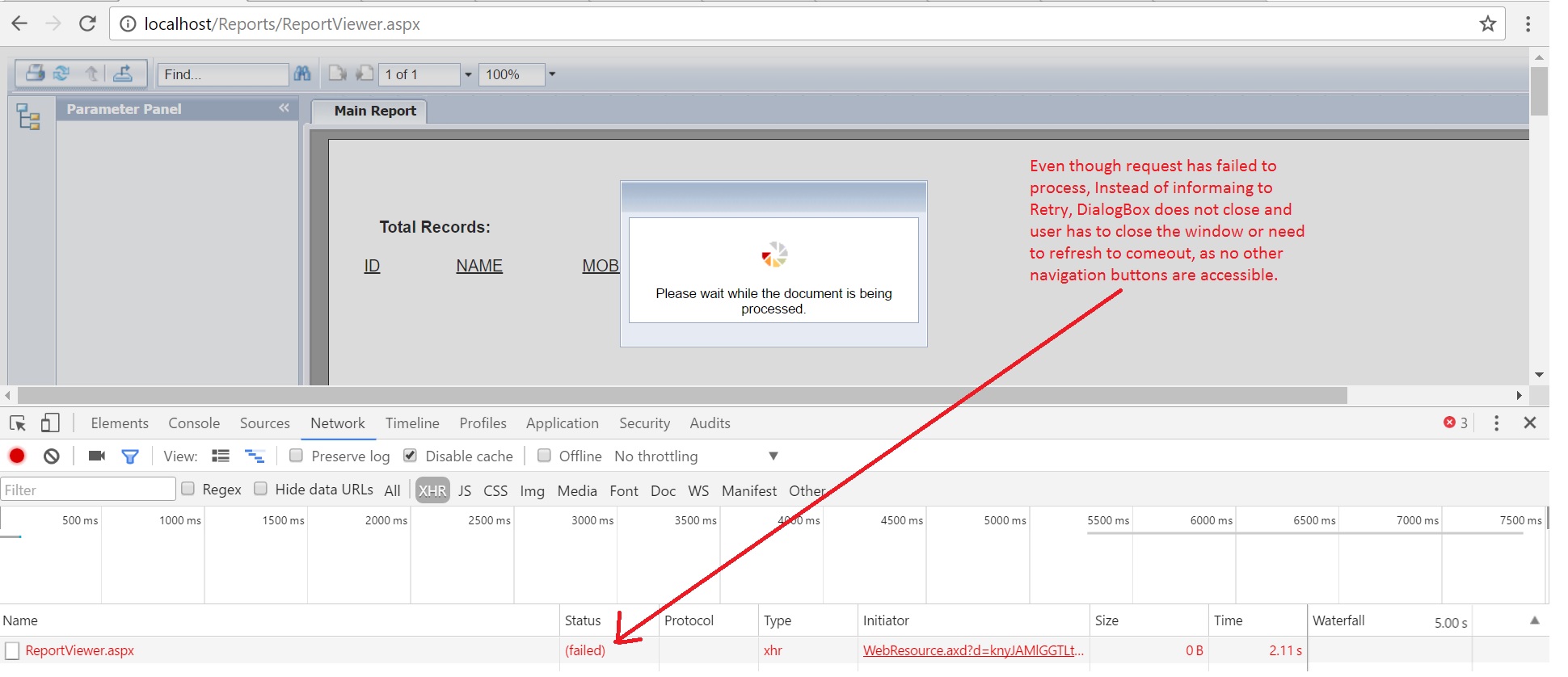 很多时候,在页面导航或报表加载时,水晶报表查看器会显示一个带有消息的模态对话框“请在处理文档时等待。”。该消息将在服务器成功请求时消失,但在许多情况下,如网络失败,服务器使用HTTP错误代码进行响应,或者在ajax请求执行失败的任何情况下,这种情况下,此模式对话框不会关闭,由于该用户一直在等待此对话框消失,但没有发生任何事情,并且用户无法导航,他们将被迫刷新页面或重新打开报表。