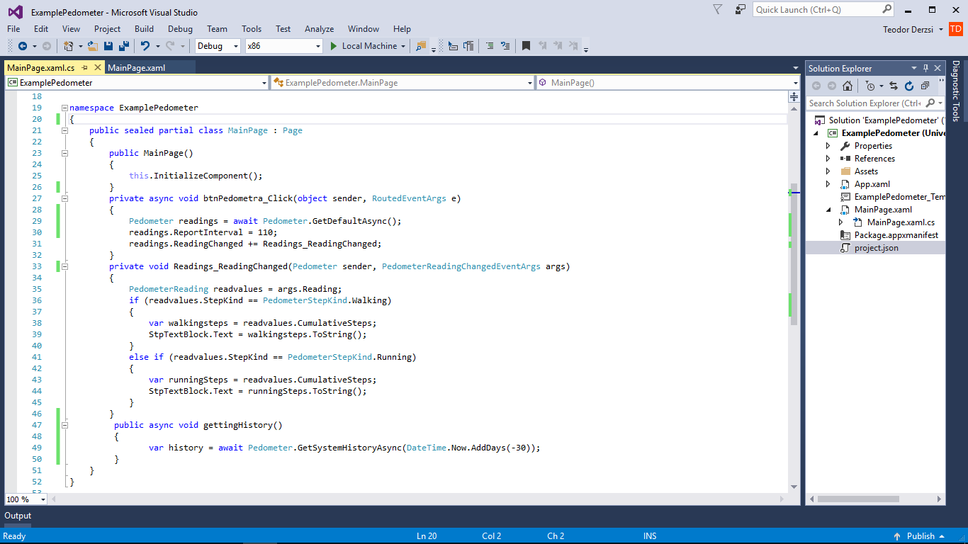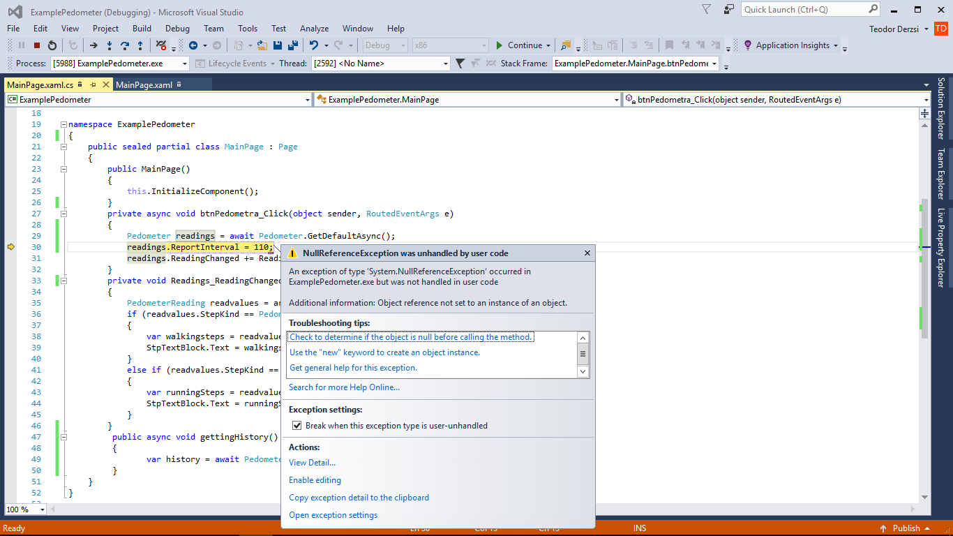 正如@rudolf的回答所说,您得到了NullReferenceException,因为Pedometer.GetdefaultAsync()返回的readings是null。