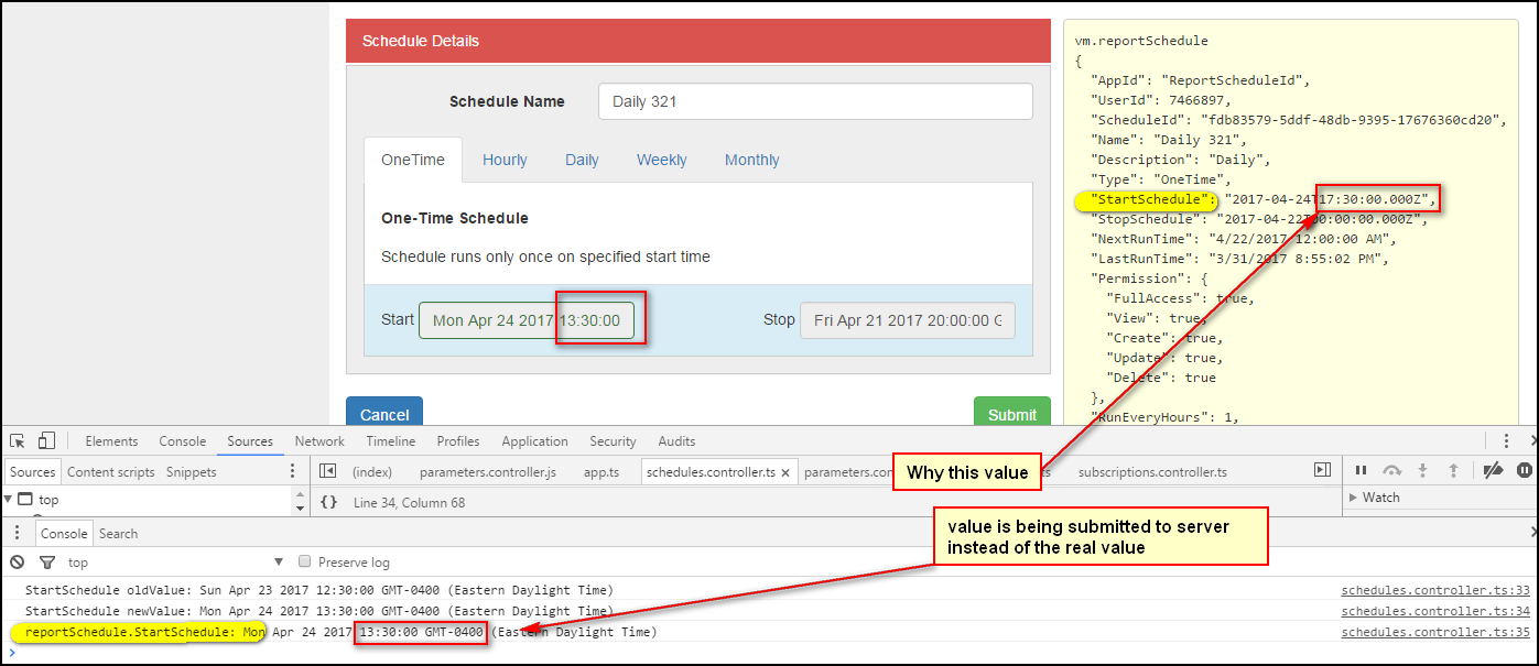 ,但最奇怪的是,当我单击Submit :) although in the console the value is correct时,"+4小时“值被发送到服务器。