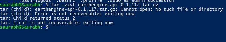 > --record /tmp/pip-3eTIvM-record/install-record.txt --single-version-externally-managed --compile" failed wit h error code 1 in /tmp/pip-build-PrUuzi/cryptography/失败后,我尝试手动下载并安装GEE安装程序。我将下载的压缩包复制到文件夹:"C:\Users\Saurabh\AppData\Local\lxss\home\saurabh“