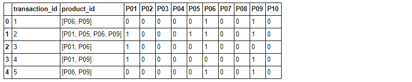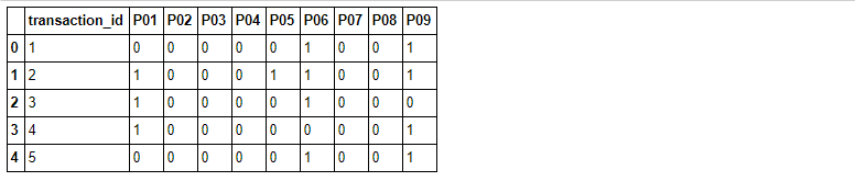 然后,我使用sklearn创建了一个矩阵,它包含product的as列和transaction_id的as行(索引)。