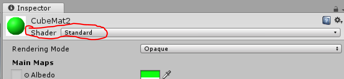 这是个阴影问题。请注意,着色器不是-相同的材料。你把着色器插进材料里。下面的圆圈图像显示了一个“标准”阴影,它被附加到一个名为"CubeMat2“的材料上。