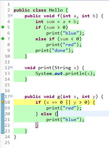 }因此,对于函数g,Eclipse表示“4个分支中有1个没有完成”,并将第18行标记为黄色。